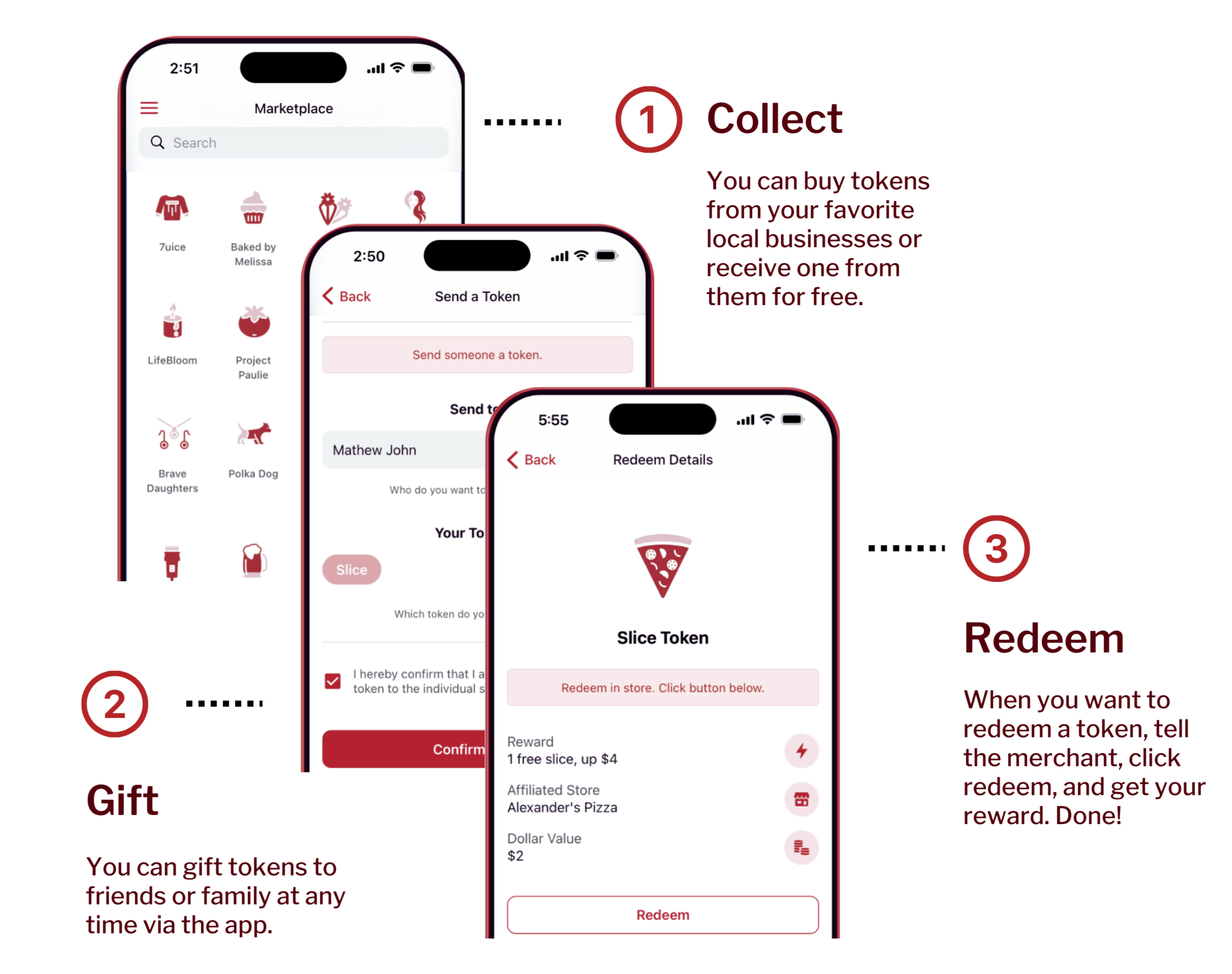We set up local businesses with tokens (represented by digital icons), with each business choosing their token's price and reward. These tokens can be redeemed by customers in-store using their app.